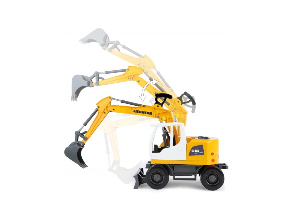 Bagr Liebherr A 918 Litronic. 6mm tlusté kovové osy u kol. Horní otočná část o 360° s možností aretace. Rameno bagru lze natáhnout 55cm. Pohyblivá přítlačná radlice.