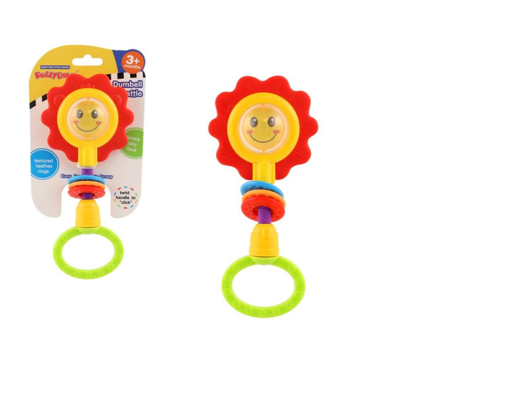 Chrastitko obsahuje uprostřed květiny krásného lvíčka nebo usměvavou tvář. Také kroužky a otáčecí rukojeť, která při pohybu vydává zvuky cvakání. Rozměr chrastítka: 8 x 19 cm Vhodné pro děti od 3 měsíců