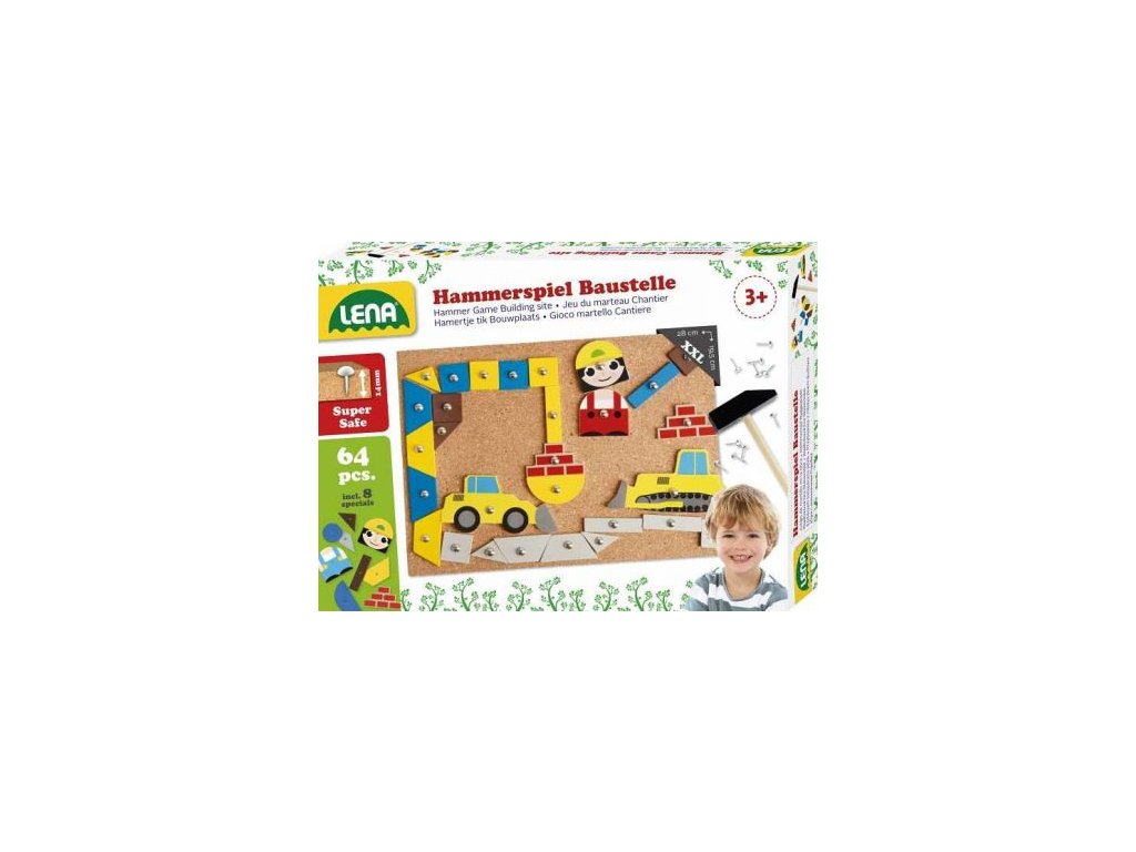Obsahuje: 56 barevných dřevěných dílků, 8 potištěných speciálních tvarů, kladívko, hřebíky a korková deska: 27x20,5cm. Podporuje kreativitu a motoriku