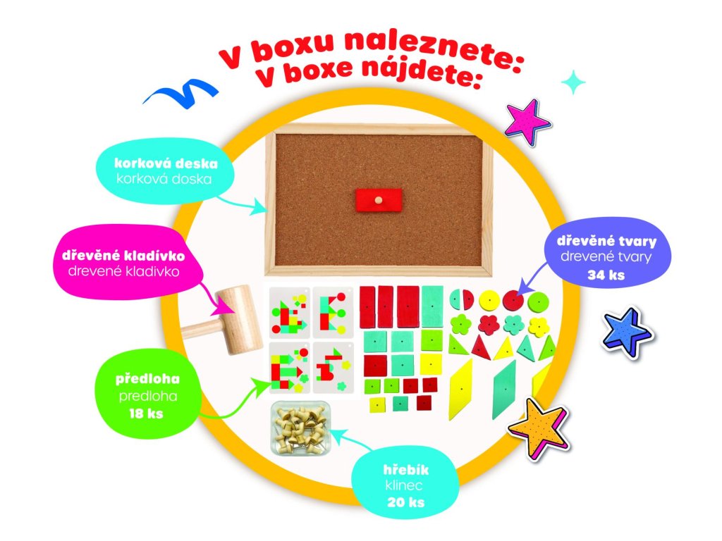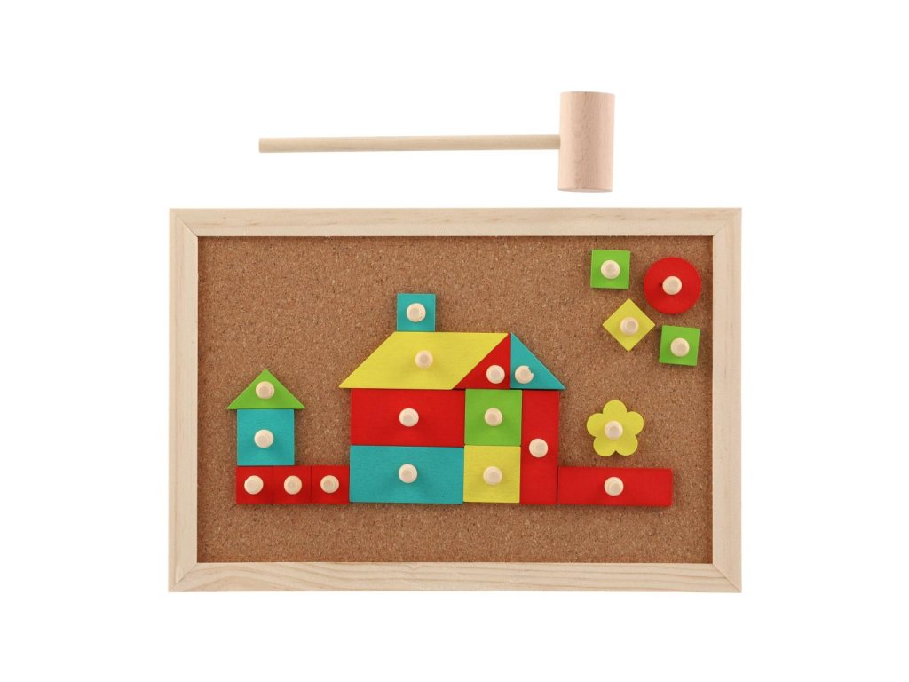 Dřevěné tvary, kladívko, hřebíčky a deska z korku – to je výtvarná klasika, která děti nejen zabaví, ale i rozvíjí! Malí stavitelé si mohou vytvářet vlastní obrázky nebo skládat podle přiložených předloh.