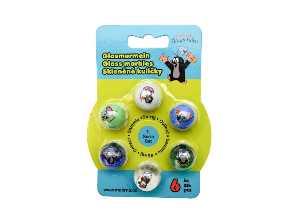 Zahrajte si s dětmi venku kuličky a nasbírejte všechny barvy i obrázky! Skleněné kuličky s obrázkem Krtka mají pr.25mm, balené na blistru, 8 různých motivů grafiky, 6 barev skla (3× čiré + 3× matné).