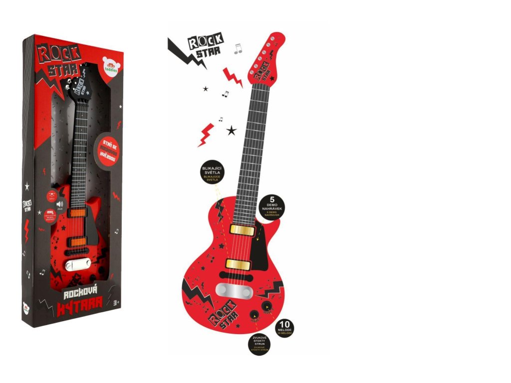 Dětská barevná kytara pro všechny milovníky nejen rockové hudby. Červená kytara s černými plameny a bílými doplňky. Kytara umí nejen hrát, ale hudbu doprovází i světelnými efekty! Funkce kytary: světelné efekty, pět demo nahrávek, 10 melodií a zvukové efekty strun... Velikost kytary: 58 cm Rozměr balení: 24 x 62 x 5,5 cm Vhodné pro děti od 3 let