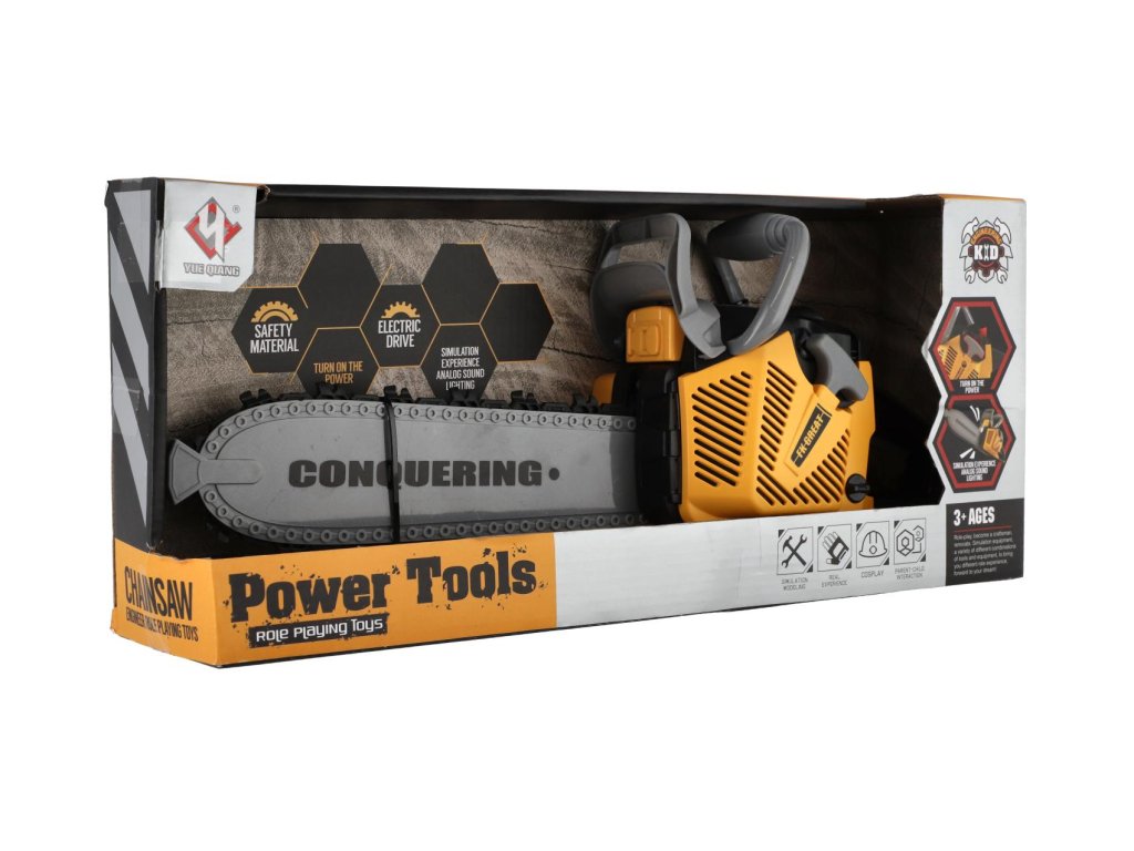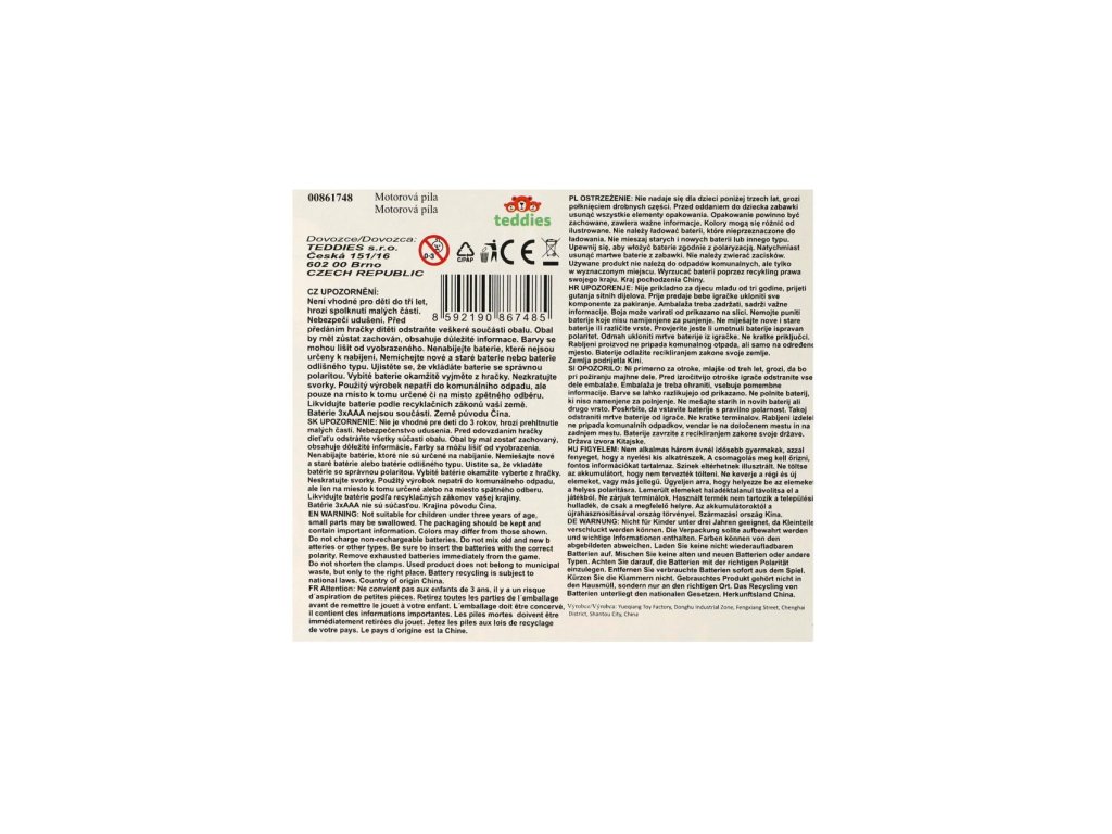 Tato řetězová pila může být skvělou hračkou ke hře na dřevorubce. Zatáhněte lehce za startér umístěný po levé straně hračky, tím spustíme pilu, tlačítko na rukojeti dává do pohybu pro děti bezpečné ostří pily. Tato pila funguje skoro jako opravdová! Baterie 3x AAA nejsou součástí balení. Rozměry balení 43 x 19 x 10 cm. Vhodné pro děti od 3 let.