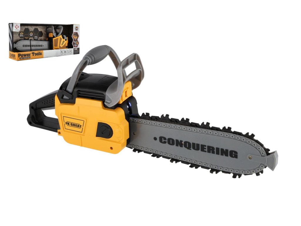 Motorová pila řetězová nářadí plast 42cm na baterie se zvukem se světlem v krabici 43x19x10cm