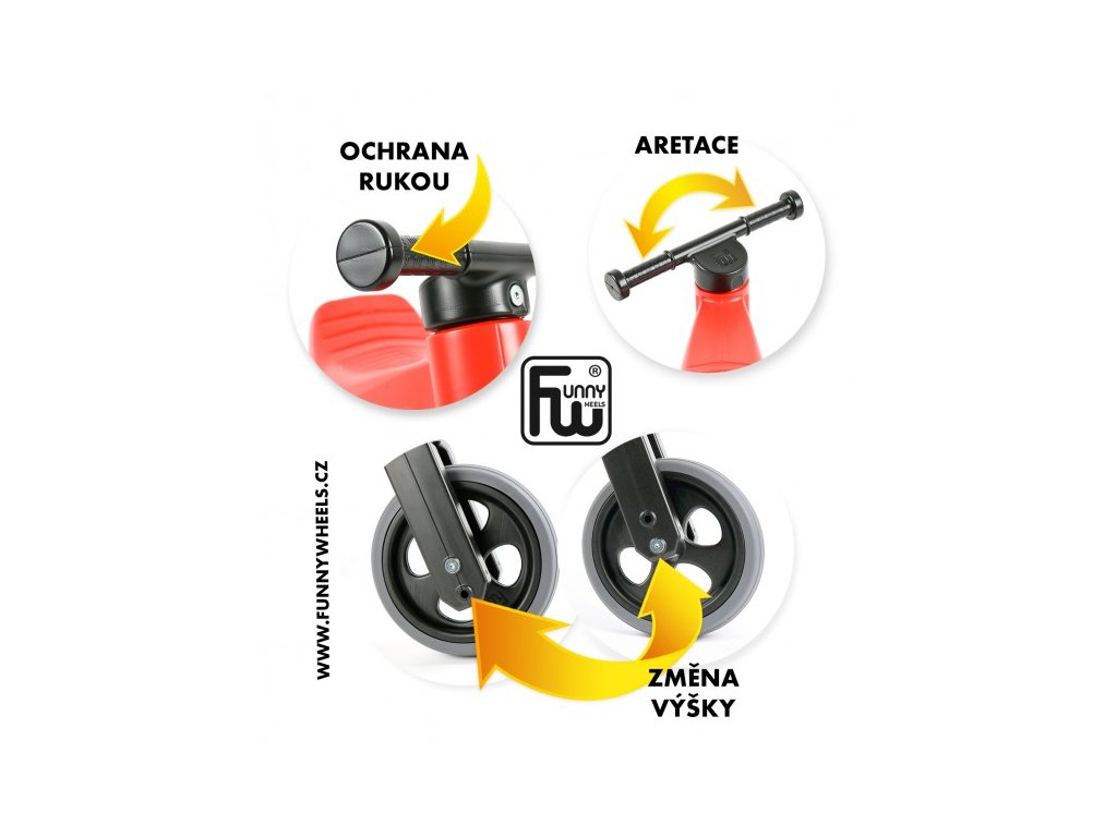 FUNNY WHEELS SPORT odrážedlo s pneumatikami, díky kterým má odrážedlo tichý provoz a kola se nekloužou. A jedééém! FUNNY WHEELS je originální české odrážedlo, které dokáže růst s vaším dítětem. Vzhledem k tomu, že můžete vyměnit dvě zadní kola za jedno a nastavit jeho výšku, nemusíte kupovat každý rok nové odstrkovadlo. FUNNY WHEELS vám vydrží, dokud nebudete kupovat první kolo. Hlavní výhody FUNNY WHEELS: 2v1 – během pár minut změníte tříkolové odrážedlo na dvoukolové 2 výškové polohy – nastavíte vpředu i vzadu (rozdíl 3 cm) Tiché pneumatiky, které nekloužou na výběr v 6 barvách – zelená, červená, modrá, růžová, oranžová, šedá cool design bezpečné i pro ty nejmenší z odolného a nezávadného plastu, se zahlazenými spoji omyvatelné vlažnou vodou a mýdlovými čisticími prostředky kompletně vyrobené v České republice FUNNY WHEELS roste stejně, jako váš prcek. Ten začne jezdit na malém tříkolovém odrážedle, až se vytáhne, jednoduše FUNNY WHEELS zvednete o 3 cm výš a jede se dál. Až přijde čas trénovat balanc, jednoduše vyměníte dvě zadní kolečka za jedno a dítko se může začít připravovat na jízdu na kole. Jak přesně to funguje, vidíte na videu. Odstrkovadlo je přitom stabilní (ve variantě se třemi koly). Vidlice má omezený rozsah otáčení a řídítka se tak nemohou přetočit. Rukojeti řídítek jsou na konci rozšířené, a tím chrání dětské ruce před poraněním. Odrážedlo je hračka, která baví snad každé dítě. S FUNNY WHEELS si užije radost z pohybu, zlepší si své motorické schopnosti a koordinaci, natrénuje pozornost, rovnováhu a třeba si i zazávodí! Vaše společné procházky budou delší, rychlejší a zábavnější. Technické parametry: doporučený věk: od 18 měsíců nosnost: 25 kg váha odrážedla: 2,1 kg výška sedla: 28/31 cm šířka řídítek: 30 cm rozteč zadních kol: 20 cm průměr kola:19 cm šířka pneumatiky: 4 cm Odrážedlo koupíte sestavené jako tříkolové. Součástí balení jsou dva imbusy a kratší osa na zadní kolo pro úpravu odrážedla na dvoukolové. Je možné zakoupit i náhradní díly – samostatná kola a osy.