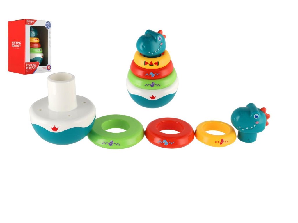 Roly Poly dinosaurus plast 16cm skládanka pyramida s kroužky se zvukem v krabičce 13x20cm 6m+