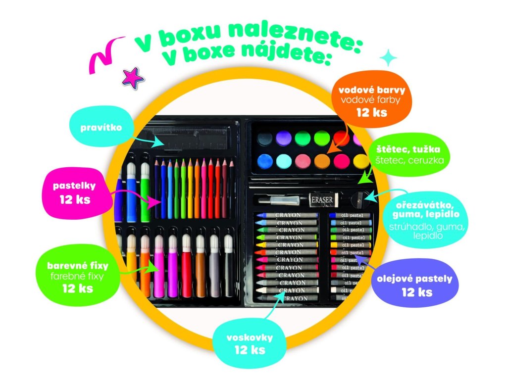S tímto kufříkem mají malí umělci vše po ruce – a mohou tvořit kdykoli a kdekoli. Ideální na doma, na cesty i do školky. Plný pastelek, fixů, vodovek a dalších pomůcek, které rozvíjejí dětskou fantazii.