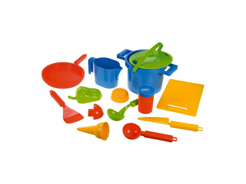 Set k vařeníse skládá ze sítko/poklička, hrnec, 3x zelenina, solnička, naběračka, obracečka, nůž, prkénko, pánev, odměrka, kornoutek, zmrzlinová naběračka.