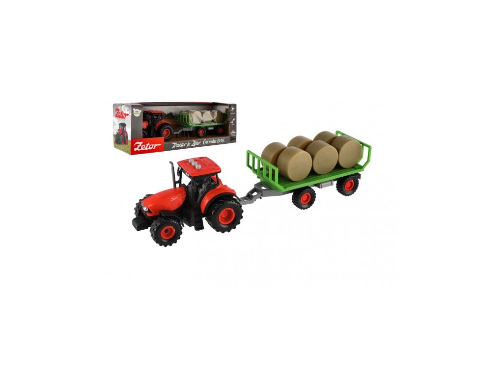 Traktor Zetor s vlekem a balíky plast 36cm na setrvačník na bat. se světlem se zvukem v krab. 39x13