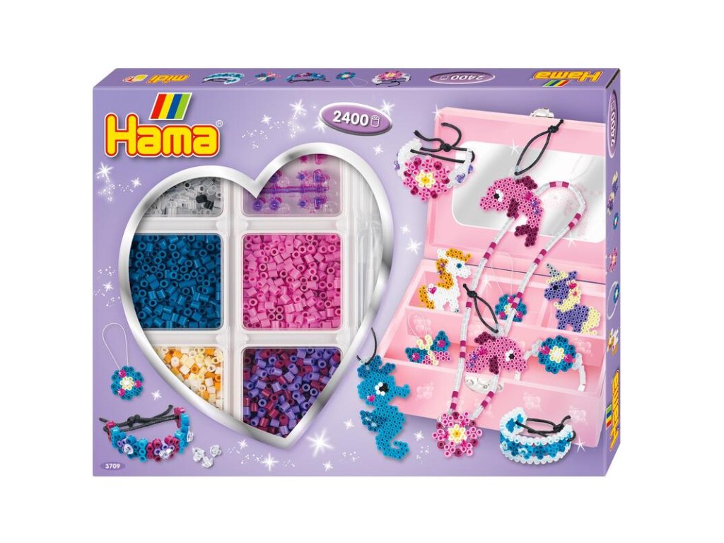 Balení obsahuje: cca 2.400 kusů zažehlovacích korálků, podložku č.H329 napojovací šestiúhelník, 4 x HAMA drahokamy, 1 x provázek, 1 x šnůrka, barevně tištěná předloha, zažehlovací papír, úložný box s víkem a návod k použití.