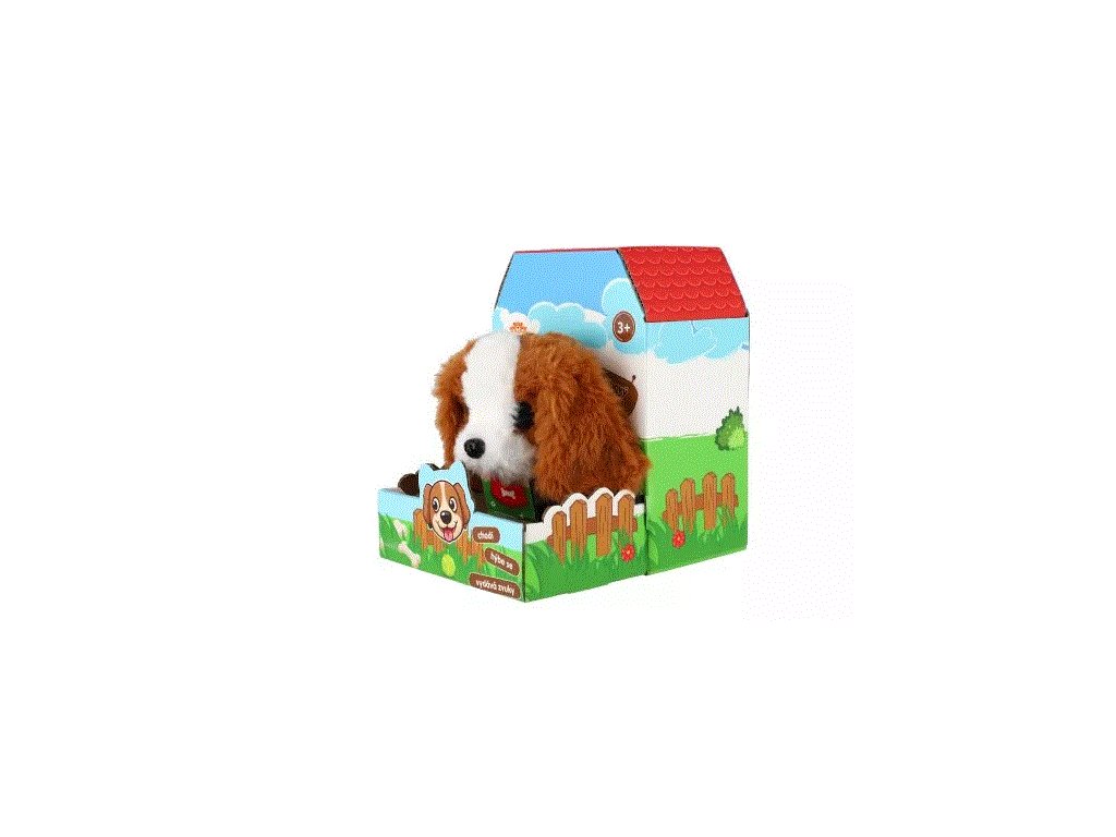 Roztomilý pejsek chodí dopředu i dozadu a vydává reálné zvuky štěkání. Pejsek je balen v krabičce, která je zároveň jeho boudou. Baterie 2x AA nejsou součástí výrobku.